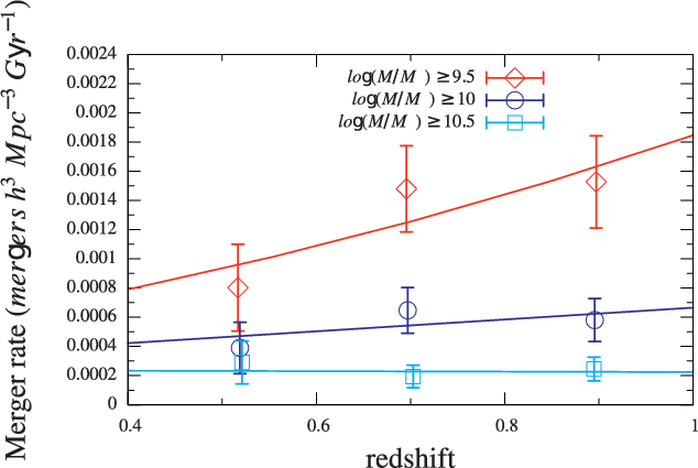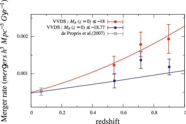 Merging two galaxies is potentially a very powerful process. It is possible that during major merger events, i.e. mergers where the two components have more or less the same mass, disks could be transformed into spheroidals, as predicted using detailed simulations (Combes 2004; Mihos & Hernquist 1996; Conselice et al. 2006). It is also expected that major merger events profoundly modify the spectrophotometric properties of the galaxies involved, for instance triggering a burst of star formation (e.g. Patton et al. 2005). Galaxies in the process of merging have been observed, however the contribution of this process to the evolution of the global galaxy population is not yet precisely constrained. Indirect evidence for merging is also inferred from other galaxy properties like the luminosity or mass function. The luminosity of the red bulge dominated population of galaxies is seen to increase since