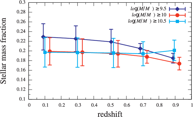has been accreted through major merging events since z = 1. This indicates that major mergers have contributed significantly to the growth in stellar mass density of bright galaxies over the last half of the life of the Universe.