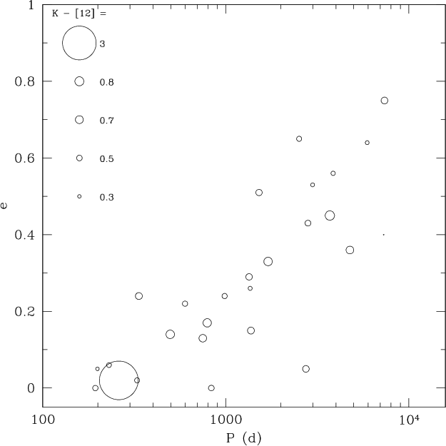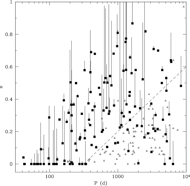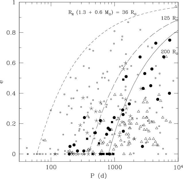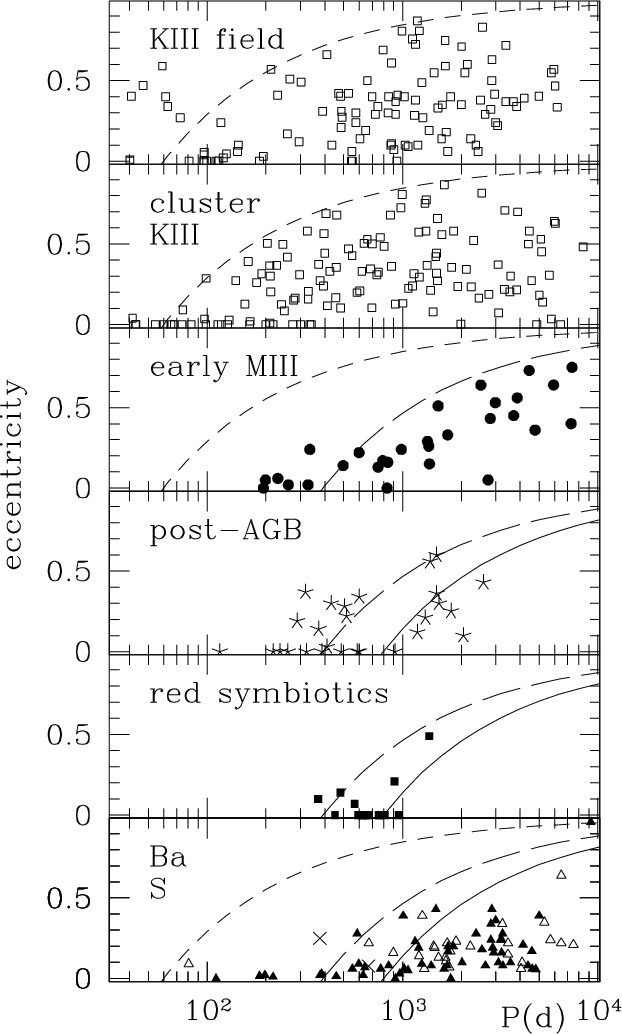 - In the sample of KIII binaries in the field, there are several systems with non-zero eccentricities falling to the left of the periastron envelope. Most of these systems are either pre-main sequence (PMS) binaries (mostly from Torres et al. 2002) or Algols (Nelson & Eggleton 2001; Eggleton 2006), i.e., (post-)mass-transfer systems (see also the discussion in relation with Fig. 6 of Paper II). The successive panels in Fig. 2 are meant to illustrate the evolution of the orbital elements as the system evolves from both components on the main sequence to one component being a white dwarf. Therefore, the Algols or PMS systems present in the sample of field KIII stars distort the picture, and should actually be disregarded.