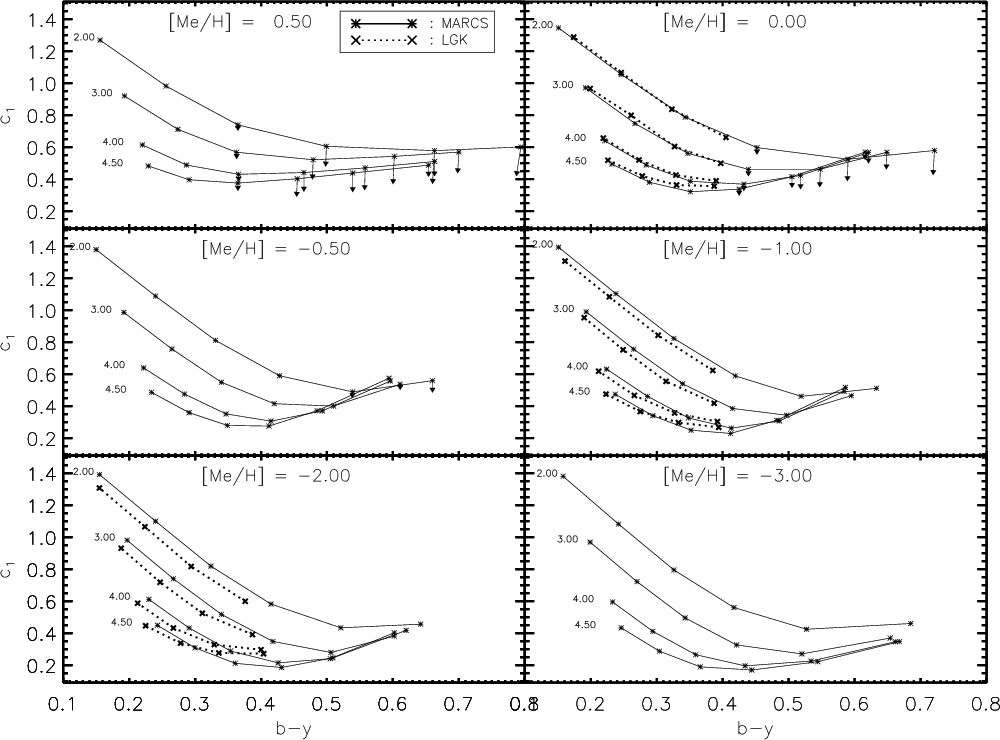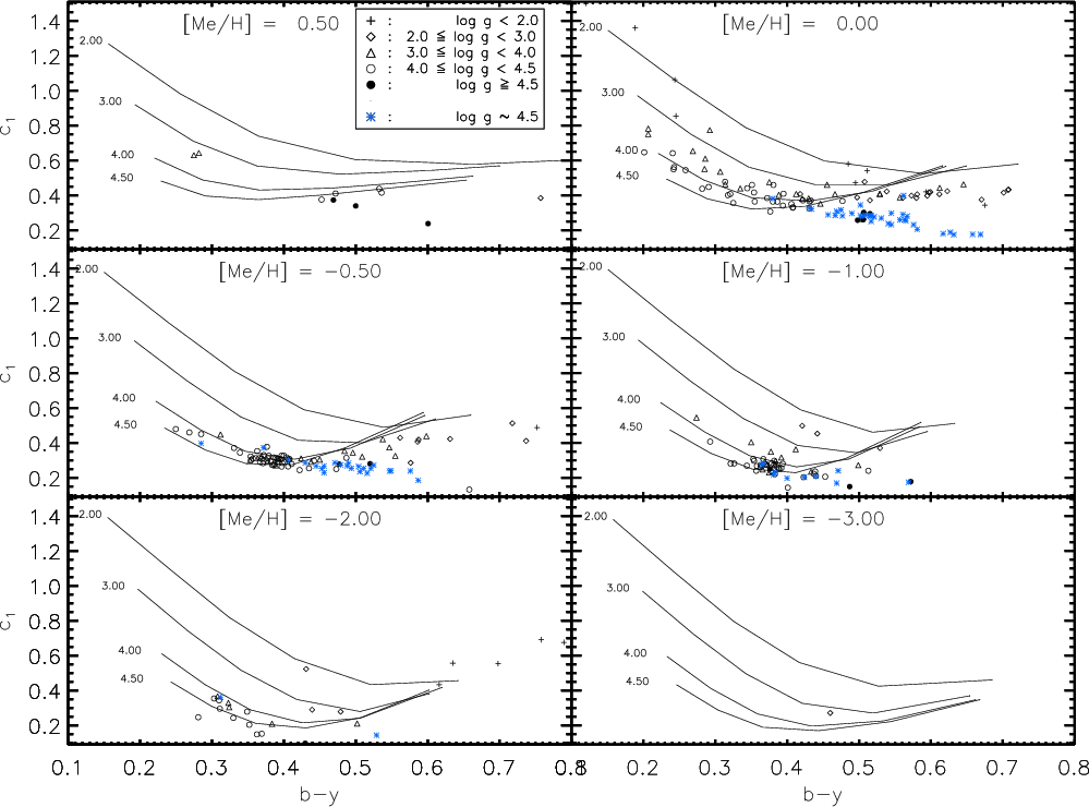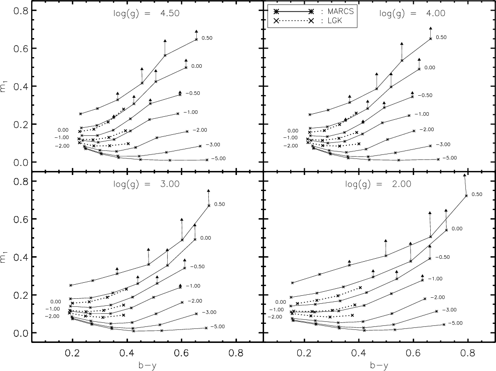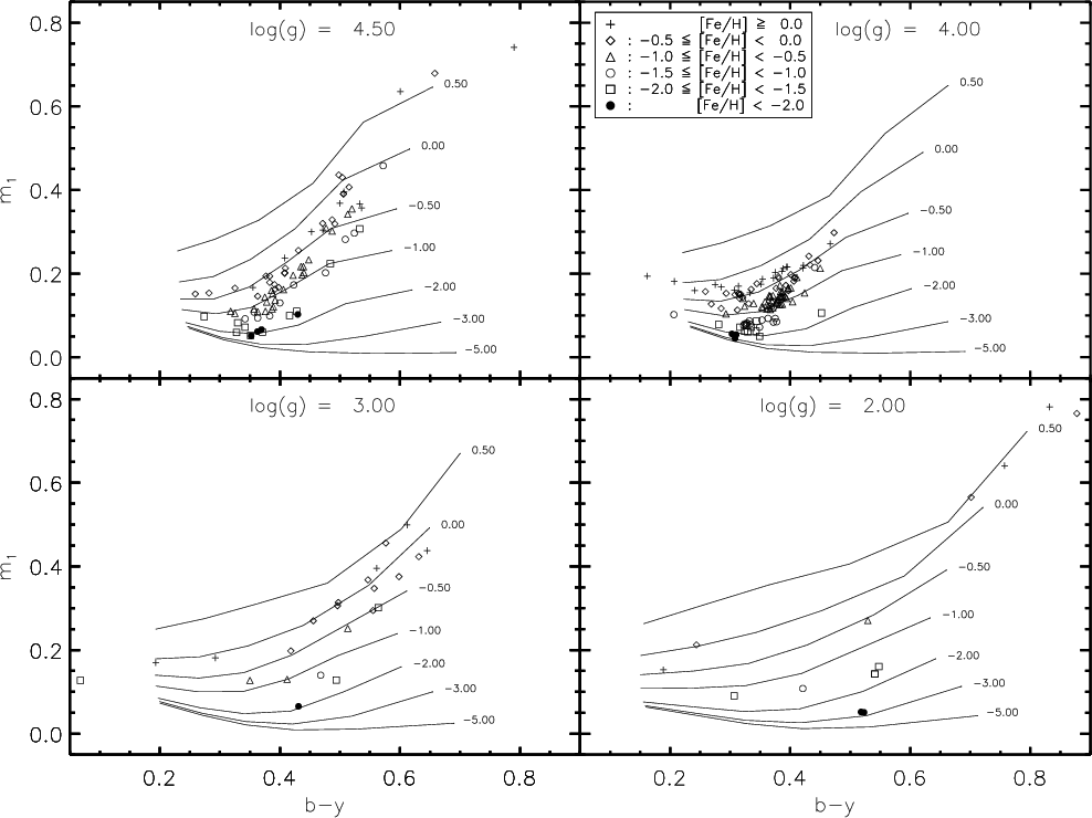 metallicity sensitivity of (b-y) and c1, or the gravity sensitivity of m1.