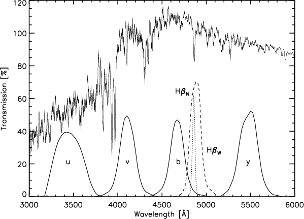 To determine the theoretical m1, c1 and (b-y) indices, transmission profiles of the Strömgren uvby filters (Crawford & Barnes 1970, see Fig. 1) were multiplied with the calculated model stellar surface flux within the wavelength range of the filters:![]() |