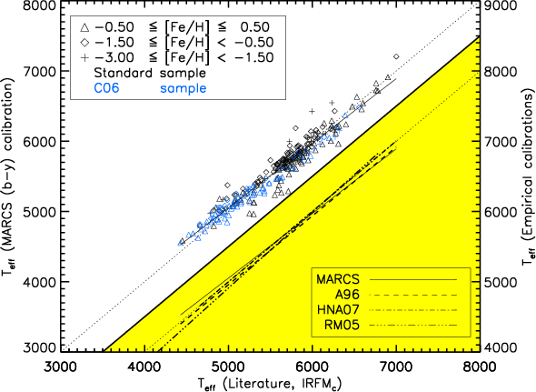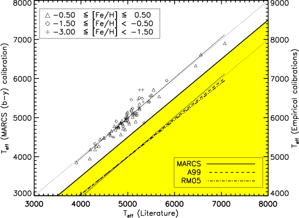 Results. We show that the temperature sensitivity of the synthetic (b-y) colour is very close to its empirical counterpart, whereas the temperature scale based upon H