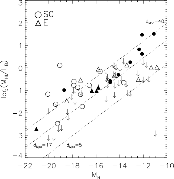 Finally an important role in evaporating H I clouds could be also played by the possible presence of a hot ISM in luminous ETGs. At this stage, unfortunately, we can derive little information about the relation between the cool and hot ISM for the LDE sample, since the overlap with X-ray datasets is very small. Few objects have been observed, but no evidence of a hot ISM has been reported in any of them to relatively low levels (O'Sullivan et al. 2001; David et al. 2006), with the exception of NGC 3379, where a small amount of hot gas is detected in an outflow phase (Trinchieri et al. 2008). A more systematic analysis of the effects of a hot plasma on the H I content of ETGs in different environments will be presented in a subsequent work (Grossi et al., in prep.).