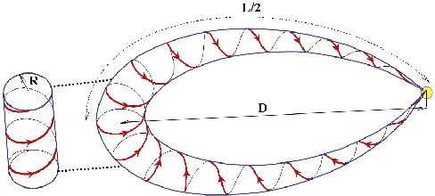Figure 1: Schematic of a flux rope ejected from the Sun (the apex of the central field line is at a distance D from the Sun). The magnetic configuration of a magnetic cloud (MC) is well represented by an elongated twisted flux tube mostly anchored to the Sun. The schematic on the left shows the locally straight approximation used in this work (A color version is available in the electronic version). |