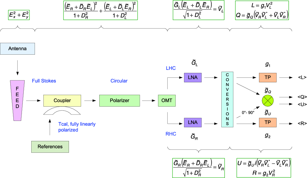 After the down-conversion, the signals are sent to the devices that perform the measurements by implementing Eqs. (4). Typical devices are square law detectors (which obtain the flux densities from the left and right channels) and multiplying polarimeters (which supply Q and U, through a 90