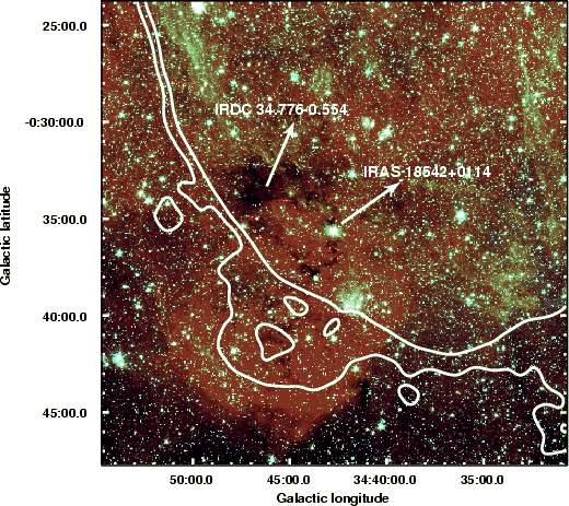 Figure 1: 13CO J=1-0 line averaged between 40 and 50 km s-1 showing the giant molecular cloud GMC G34.8-0.6. The thick blue contours outline the radio continuum emission of the SNR W44 and the HII region G034.8-0.7 at 20 cm. The cross shows the position of IRAS 18542+0114. |