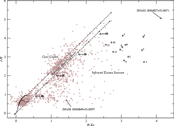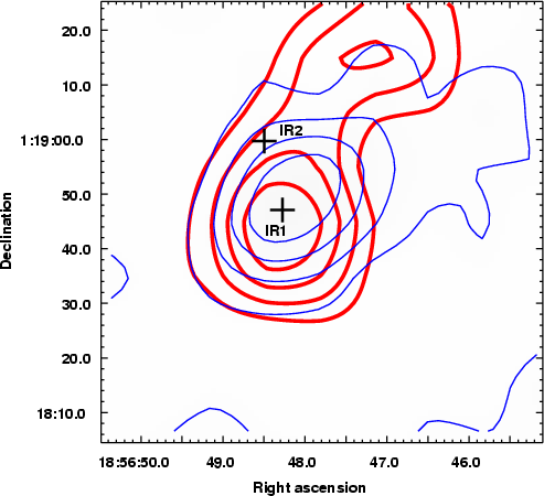 IRAS 18542+0114 (cross in Fig. 1) is resolved into several sources in the Two Micron All-Sky Point Source Catalog (2MASS, Cutri et al. 2003), and according to color criteria (see Sect. 3.1) some of them are young stellar object (YSO) candidates.