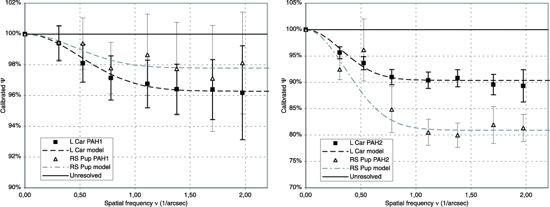 Car and RS Pup. This is done through a parametrization of the envelopes in terms of fractional flux (with respect to the star) and angular size.