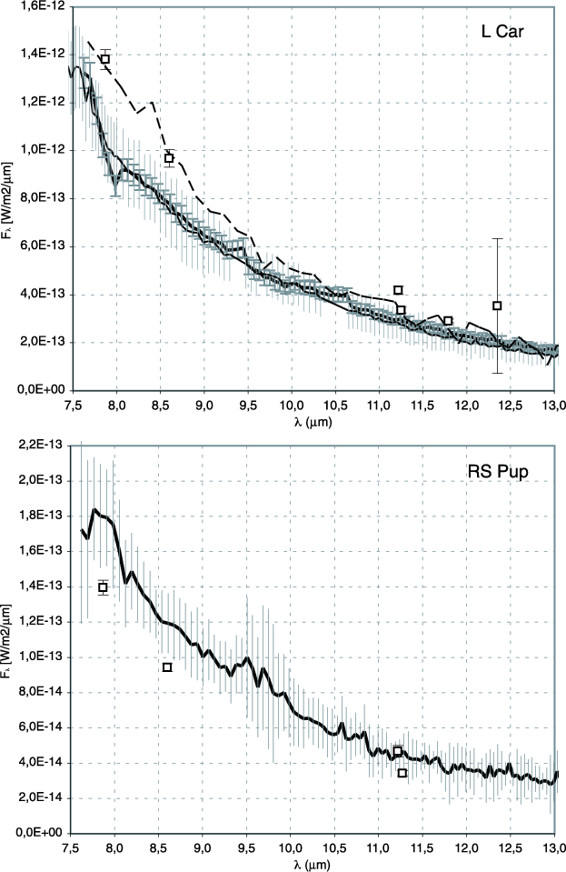 Car (HD 84810, SAO 250683) and RS Pup (HD 68860, SAO 198944) using single-telescope and interferometric techniques in order to search for and characterize the mid-IR excess of these stars. We detail the data sets obtained with the Spitzer, VLT/VISIR and VLTI/MIDI instruments in Sect. 2. Sections 3 to 5 are dedicated to the analysis of the data, while we summarize in Sect. 6 the VINCI data of