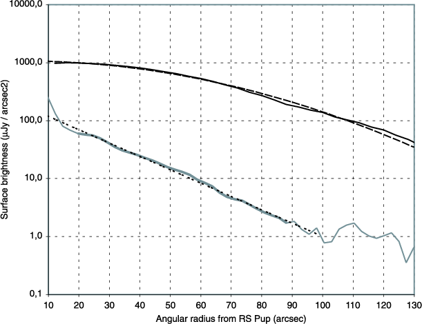 f_{70~\mu{\rm m}}({\rm RS~Pup~CSE}) = 1081 ~ \exp{\left[-\left(\frac{\theta}{49.6}\right)^2\right]}