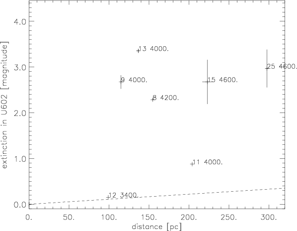 It is clear from this test case that a larger field than our 36 square arcmin should be used in order to include more stars at the relevant distances. The photometric classification is in most cases adequate, but we noted exceptions. One reason for exceptions is probably significantly lower metal abundance. It is known (Buser & Kurucz 1992 ) that colour indices including the U band do depend on the metal abundance. In order to quantify this effect we have used a set of model atmospheres with [Fe/H] = -1, and the difference compared to solar abundance in the U-I colour index is 0.3 mag for late M stars. This is far more than the photometric accuracy. It is likely that the mismatch for star No. 13, discussed above, is caused by a low metal abundance. Again, a larger field would include more stars at a relevant distance and make it easier to exclude stars with very different metal abundance compared to the majority of the stars. In any case, follow-up spectroscopic observations of the stars identified by the photometry as being located closely in front and behind the cloud would be useful for verifying (refining) the spectral classification.