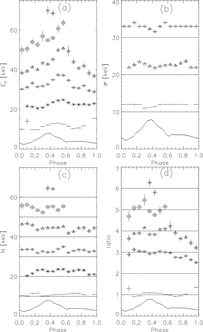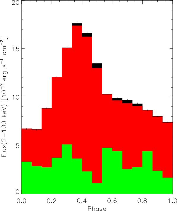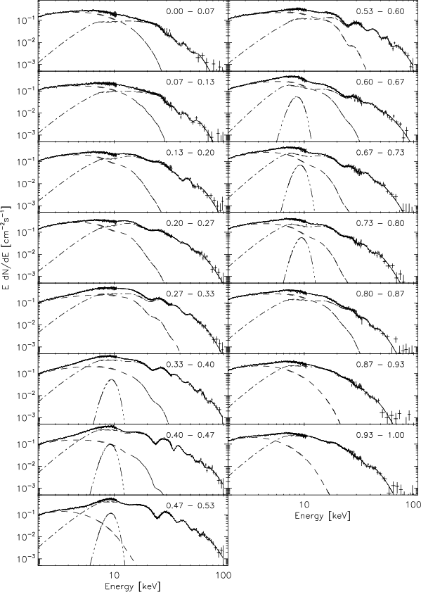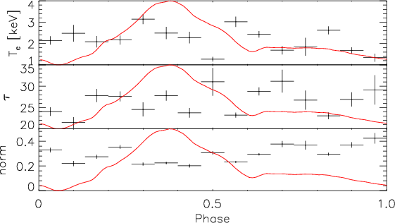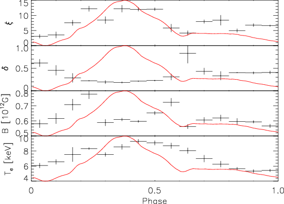 Unequivocal interpretation of the phase-dependent parameters using the theoretical model would require some estimate of the angles for the system. I.e., the angle between the line of sight and the rotation axis, and the angle between the rotation axis and the accretion column. These two angles would determine the portion of the column visible during a given phase, as well as the angle between the normal to the column and the line of site to the observer. Relativistic ray tracing should be used to study the influence of the system geometry on the emission pattern, but this is beyond the scope of this paper.