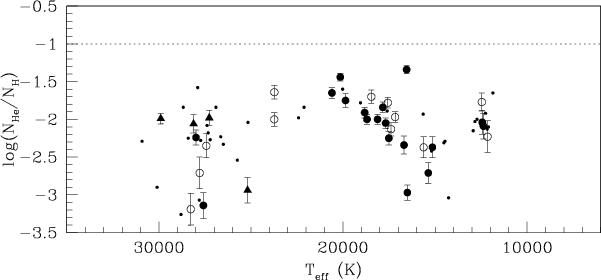 Momany et al. (2004,2002) found that at temperatures hotter than 23 000 K HB stars deviate again from canonical tracks in the color-magnitude diagram, and they proposed a new onset of diffusion as explanation of this feature. The low helium abundances found by Moehler et al. (2000) and M 07 on some hot stars seem to confirm this hypothesis, but the pattern of abundance with temperature is unclear.