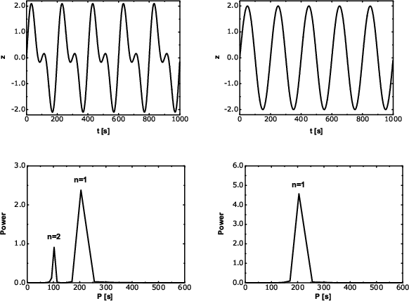 These time signatures correspond to wave signals which are collected in time at x=L/4 (left panel) and at