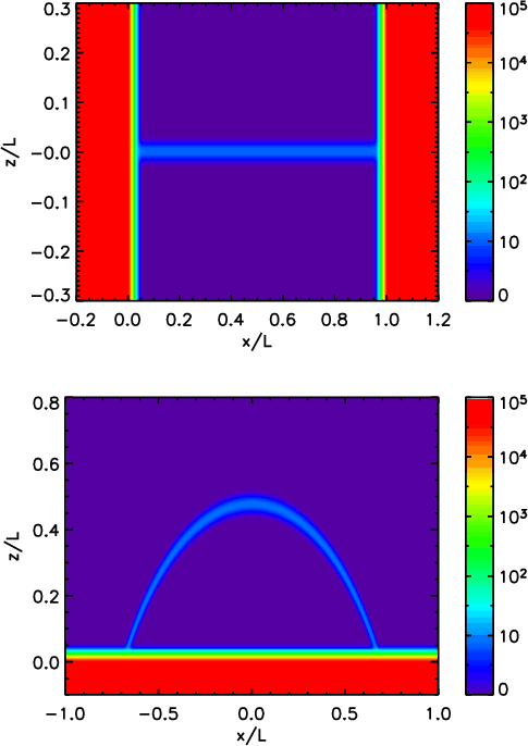 medium. Other curved slab parameters (footpoint separation, 1.4 L, and a half-width of the slab at its footpoint, 0.025 L)