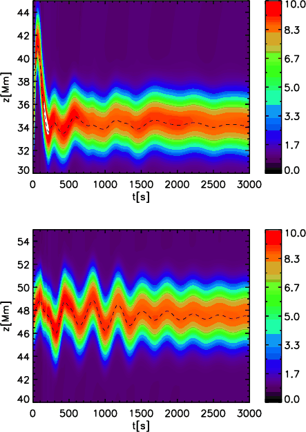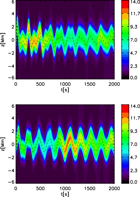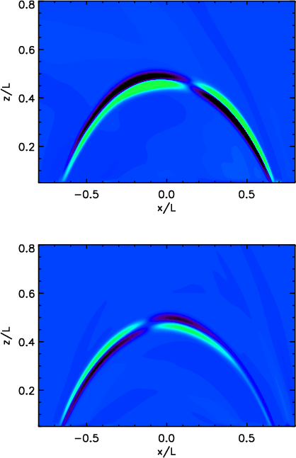 Typical time signatures that result from the velocity pulse are shown in Fig. 7. After a significant initial shift (top panel), the curved slab begins oscillating. Mass density profiles exhibit kink oscillations for which the node changes its position close to the slab apex (Fig. 8). This behavior agrees with the analytical solution for both string oscillations (Fig. 1) and a straight slab (Fig. 6). The other two nodes are located at the footpoints.