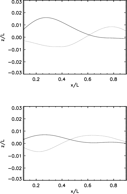Figure 6: Positions of the straight slab center for a case of Fig. 4. Top panel: solid (dotted) line corresponds to t=100 s (t=260 s). Bottom panel: t=305 s (solid line) and t=510 s (dotted line). |