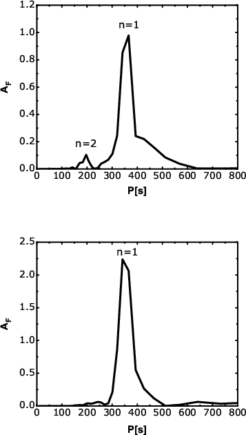 Figure 9: Fourier power spectra of the wave signals shown in Fig. 7. Top panel corresponds to the detection region at x=-0.4 L while bottom panel to x=0. |
