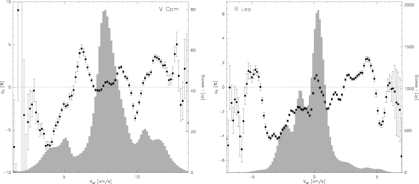 Figure 1: Spectra of total power (Stokes I, i.e. polarized plus unpolarized flux density) and of fractional circular polarization. Grey-shaded histogram: Stokes I flux density in Jansky vs. (the radial velocity with respect to the local standard of rest). Dots with errorbars: fractional circular polarization , in % with respect to Stokes I. Left: Mira-type star V Cam. Right: Mira-type star R Leo. |