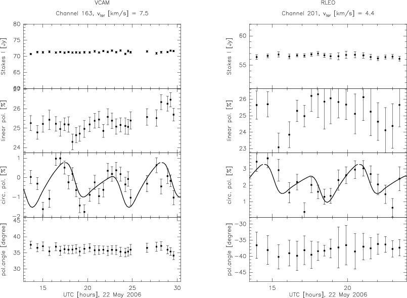 Variations in the circular polarization of 4% peak-to-peak amplitude were found again in August 2008 (Fig. 4), but now within two and wider velocity intervals, from = -3.6 to -2.7 km s-1 and from -0.5 to 0.7 km s-1. A meaningful Lomb analysis, as applied to the 2006 data, was impossible for these data, because the observing interval was too short to measure afull fluctuation period. The data (Fig. 4 left and middle) suggest a period of about 2 h with an estimated uncertainty of about 0.5 h. We note that in channels of relatively strong Stokes I emission, no significant polarization fluctuation was found (Fig. 4, right), while the linear polarization at about =0.6 km s-1, where Stokes I is strong, now also seems to fluctuate. This again excludes artifacts as being the reason for the fluctuations. If they were of instrumental origin, the entire spectral band would be affected.