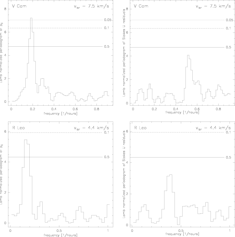 V Cam and R Leo, respectively (Fig. 3, left panels). We note that the Lomb periodograms of the Stokes U residuals do not show any significant periodic signal (Fig. 3, right panels).