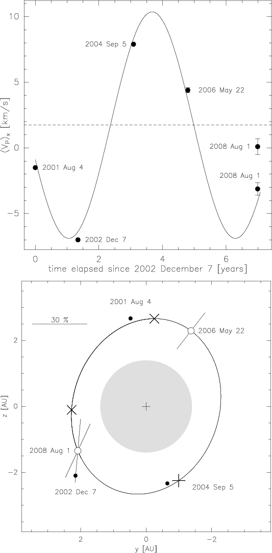 Top: Keplerian velocity fit of maser features associated with the suggested planet (LSR velocities at the tip of the planetary wake flow, and velocities of polarization fluctuations). Time is in years since 2001 Aug. 4 (observations of Cotton et al. 2004). Other references: Soria-Ruiz et al. (2007, 2002 Dec. 7), (Cotton et al. 2008, 2004 Sep. 5), this work (2006 May 22 and 2008 Aug. 1). Bottom: available astrometric information and least-square fit of the derived planetary orbit (Appendix A), for d=113.5 pc stellar distance. VLBI positions are indicated by black dots. The planetary orbit is indicated by the black line, crosses mark the fitted position at the VLBI epochs. Empty circles give the positions of the planet at the epochs of our polarization measurements. The linear polarizations measured by us and their position angles are shown as bars (the bar in the top left corner indicates a fractional linear polarization of 30%). The grey-shaded disk indicates the measured |