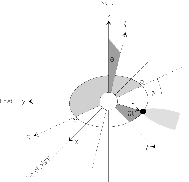 The coordinate systems applied and the orbital parameters are defined in Fig. A.1.