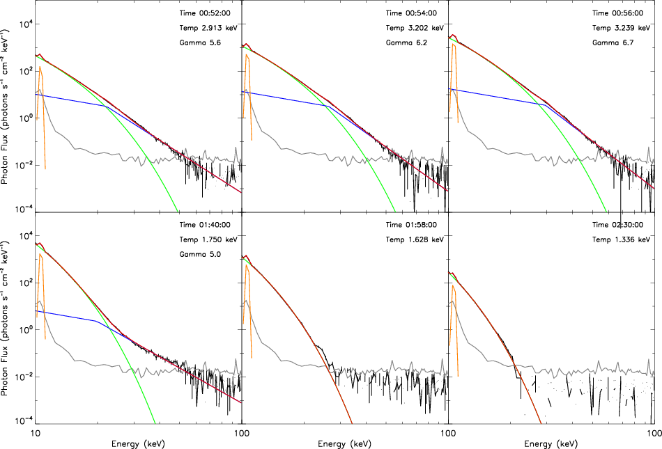 Figure 5: RHESSI spectra around the flare peak time. The black and grey lines show the noise-subtracted datapoints and the level of the background, respectively. We fitted the spectra with an isothermal component (green lines) characterized by a temperature reported in each plot, and with a broken power law component (blue lines), characterized by a fixed spectral index of 1.5 below the power law break energy. An additional Gaussian line (orange) was added to fit the line feature seen at 11 keV. The red lines are the overall fits. |