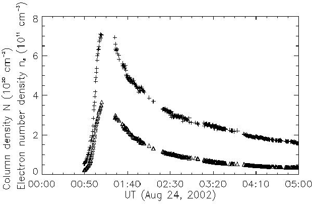 Using the method of Veronig & Brown (2004) we also computed the temporal variation of the loop column density N. We used TRACE images to define the volume