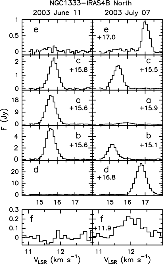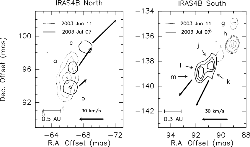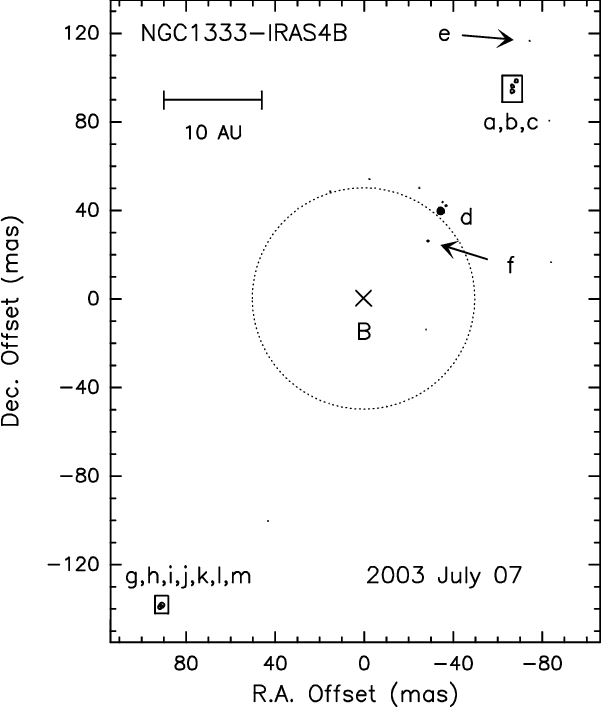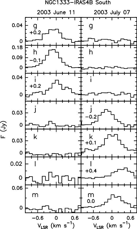 In IRAS 4B water emission was detected on June 11th and July 07th. Figure 1 reports the July 07th map: up to 13 H2O spots (labelled ``a'' to ``m'') showing a remarkable degree of collimation are seen. As a reference, the cross in Fig. 1 reports the coordinates of B following Reipurth et al. (2002) who gave the position of the NGC 1333 protostars, observed at 3.6 cm, with a 50 mas uncertainty (dotted circle). The spot ``f'' is the closest one to the B coordinates, being inside the uncertainty area. Two boxes located at about (-70 mas,+100 mas) and (+70 mas,-130 mas) mark the regions where the majority of the spots have been detected and that are shown in the zoom-in of Fig. 2. In particular, these spots (``a'' to ``c'': upper panels; ``g'' to ``m'': lower panels) are the only ones detected in two epochs (Jun. 11th and July. 07th). The high degree of variability of the H2O maser emission is clearly shown by the comparison between the integrated emission maps of different epochs, as well as the H2O line profiles reported in Figs. 3 and 4. Note that the present angular resolution does not allow us to disentangle spots ``i'' and ``j'' as well as spots ``k'' and ``l''. However, these spots are well identified by different radial velocities, as shown by the spectra and by the channel maps of Fig. 5.