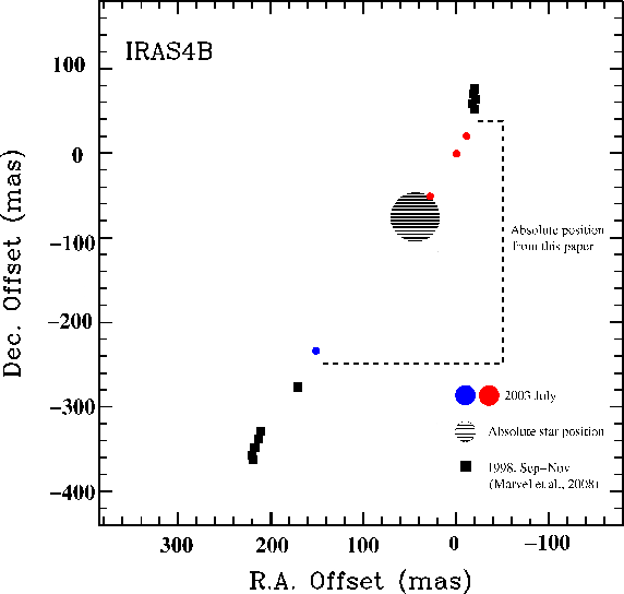 Figure 7: Comparison between the position angle of the H2O chain as observed by Marvel et al. (2008) without phase referencing (black squares) and as reported in the present paper (2003 July; filled squares; red and blue in the electronic edition only). After 5 years, the position angle remains the same (see text). The large circle is the position and corresponding uncertainty of the B protostar. |