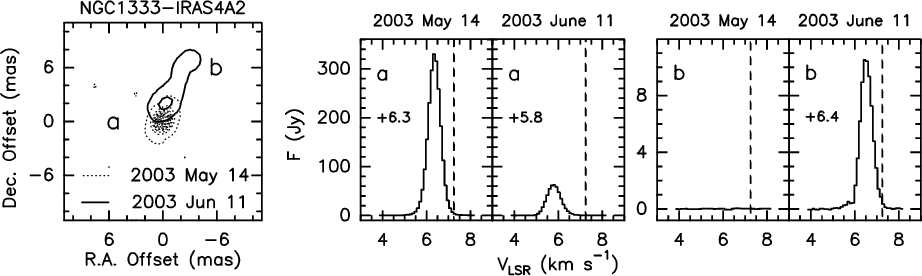 Left panel: water maser maps measured for IRAS 4A