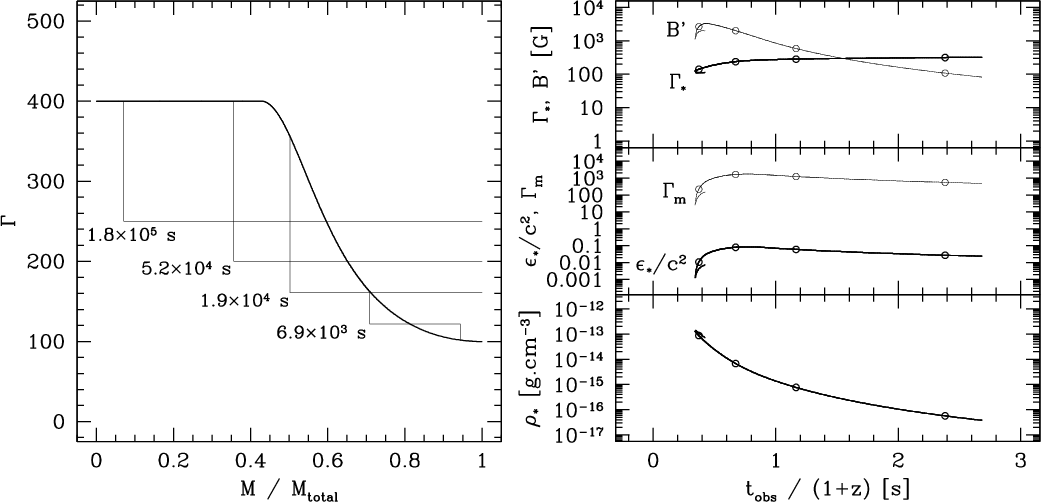 ). This is illustrated in a simple example shown in Fig. 1, where the Lorentz factor distribution in the outflow is plotted at different times t, and the physical conditions in the shocked medium are plotted as a function of