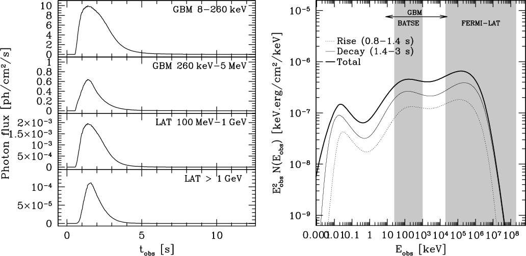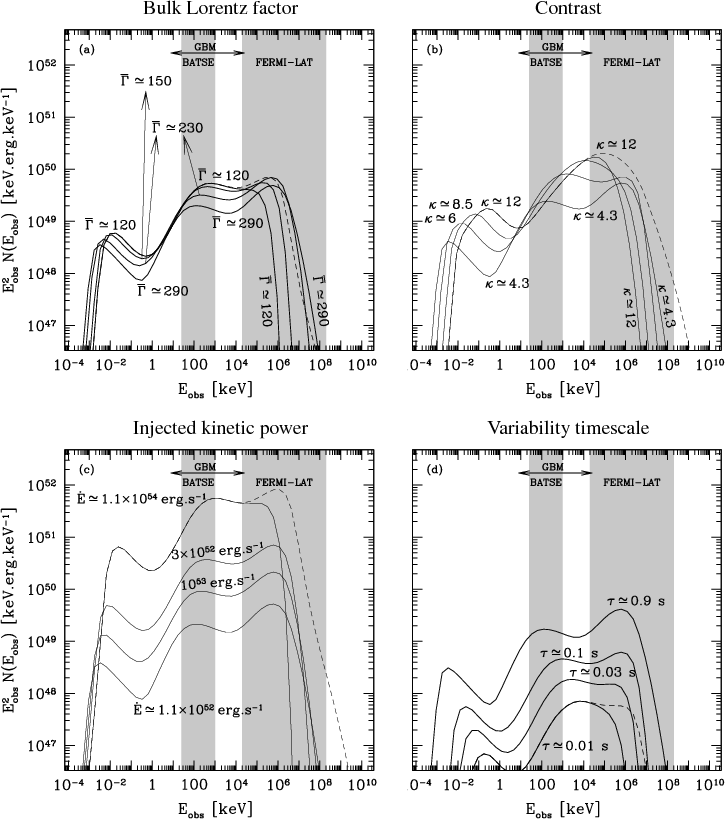 ejection process by the central source is highly variable. A high energy spectral component is expected within this framework (see e.g. Pe'er & Waxman 2004; Asano & Inoue 2007; Razzaque et al. 2004; Papathanassiou & Mészáros 1996; Sari & Piran 1997; Ando et al. 2008; Gupta & Zhang 2007; Pilla & Loeb 1998; Galli & Guetta 2008; Fan & Piran 2008; Guetta & Granot 2003). The typical GRB spectrum in the low gamma-ray range, as observed for instance by BATSE, is a smoothly connected broken power law with a break energy in the range 0.1-1 MeV. This component can be directly produced by synchrotron radiation from the shock accelerated electrons,