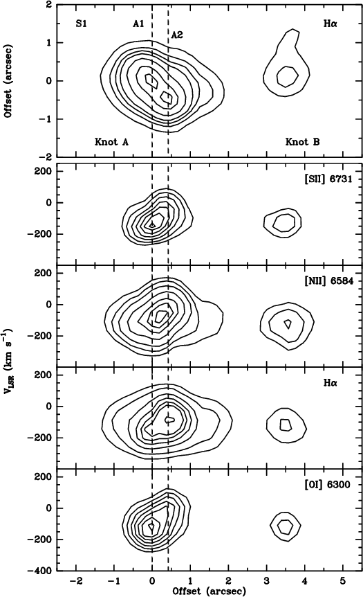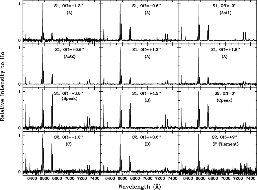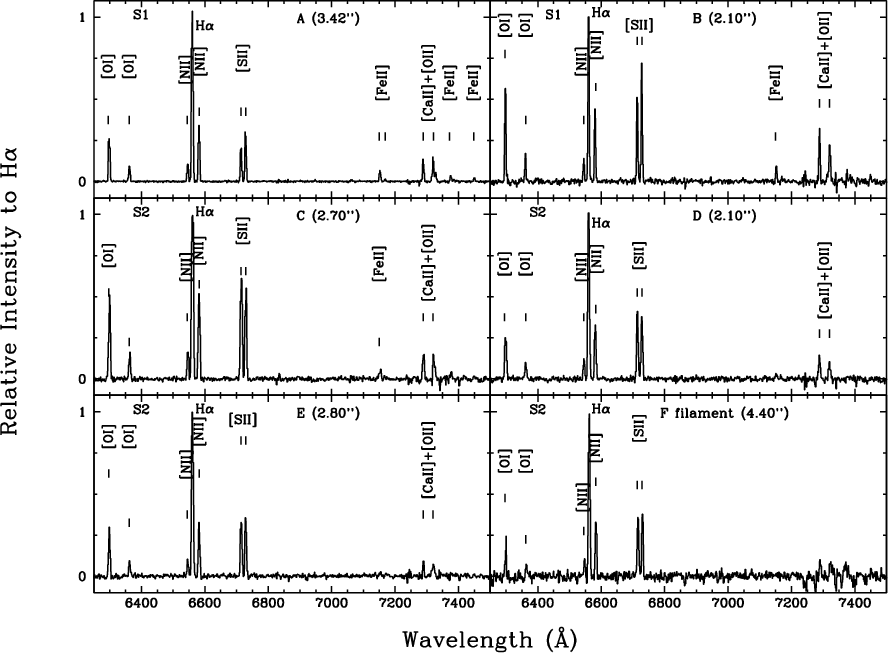 - For all the knots, the spectrum appears produced by shock-excited gas, characteristic of the HH objects.