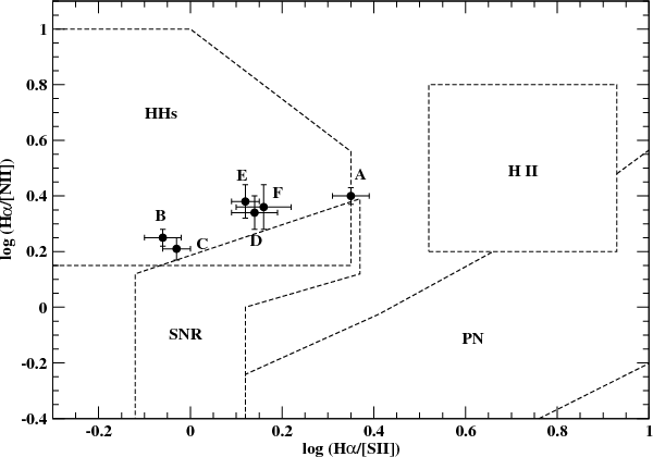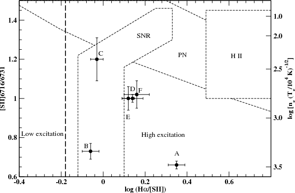 Figure 4: Position of the HH 223 knots in the excitation vs. density diagnostic diagram. The long-dashed line gives the separation between high/intermediate and low excitation HH spectra (see Raga et al. 1996). The regions of the planetary nebulae (PN), supernova remnants (SNR) and H II regions (H II), adopted from the figures of Meaburn & White (1982), are outlined. |