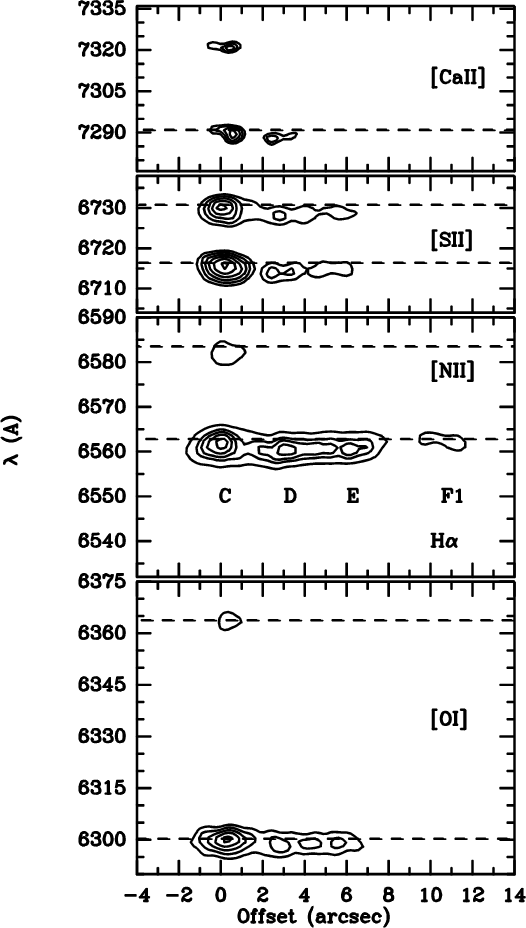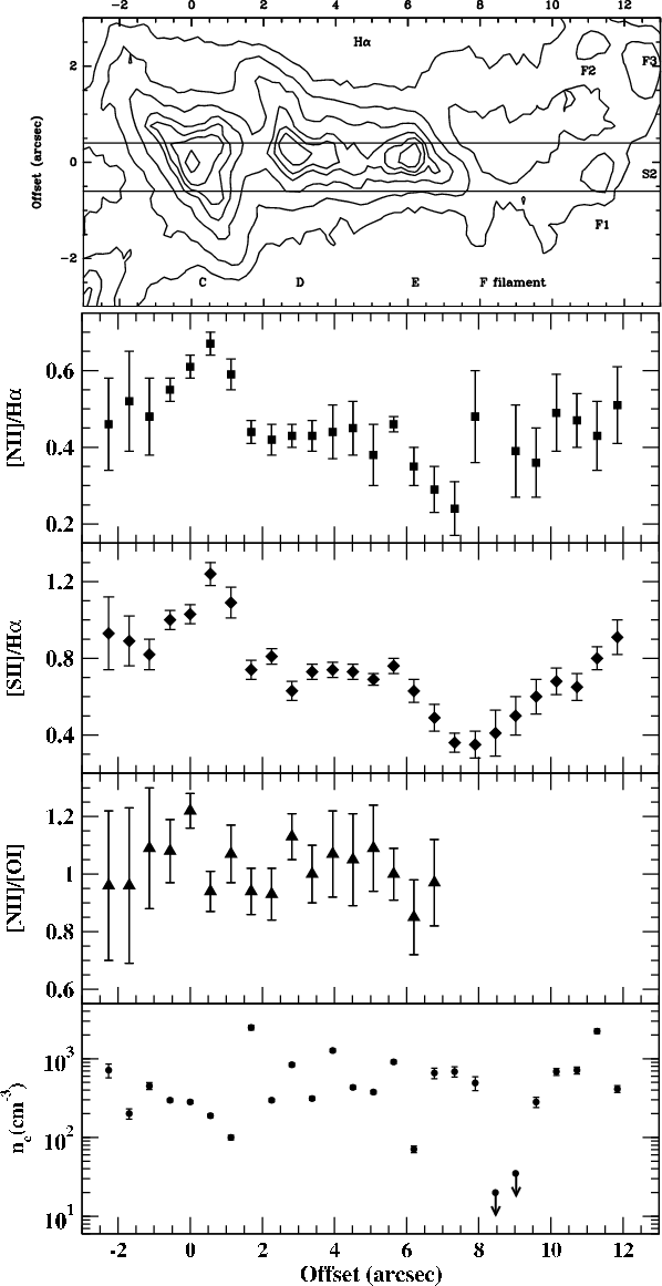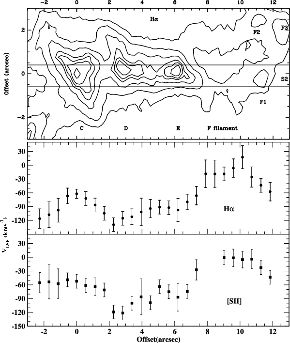 value. Interestingly, the emission intersected by the slit at these positions mostly comes from the F filament, out of the three faint knots (F1-F3) found