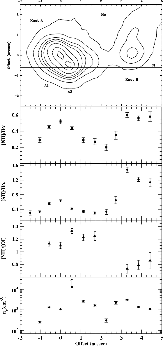 103 cm-3 in knot E. Knot A is the densest and has the highest excitation and ionization. The lowest excitation and ionization is found in knot B.