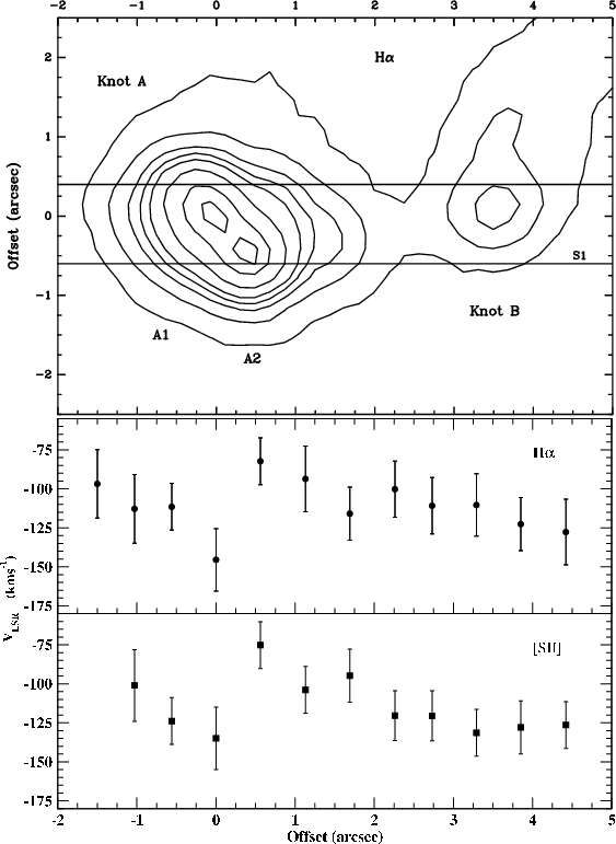 the two emission peaks, A1 and A2, of the narrow-band image (see also Fig. 7). The radial velocity has only small variations along knot B, reaching similar values to those found for positions eastwards of A1.