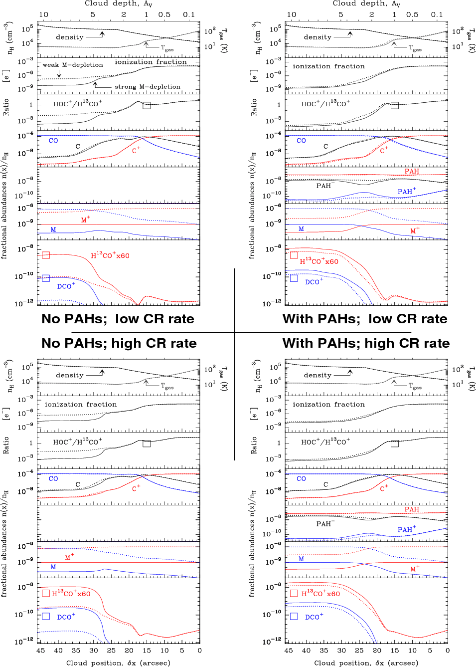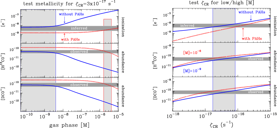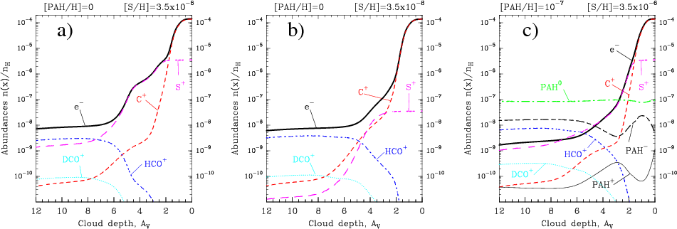 s-1. The inclusion of PAHs modifies the ionization fraction gradient and increases the required metal abundance.