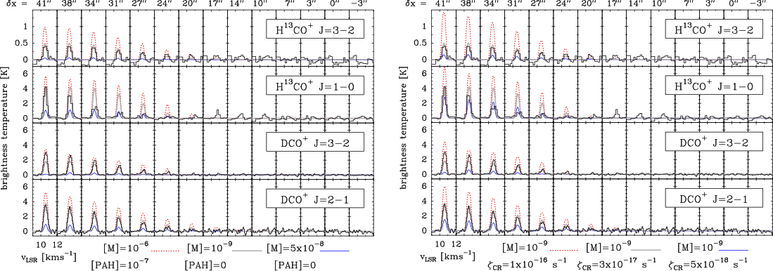 The paper is organized as follows. The observations are presented in Sect. 2 and the models used to interpret them are described in Sect. 3. The chemistry of H13CO+, DCO+ and HOC+ (our observational probes of the ionization fraction) is analyzed in Sect. 4. In Sect. 5 we investigate the role of metals, PAHs and
