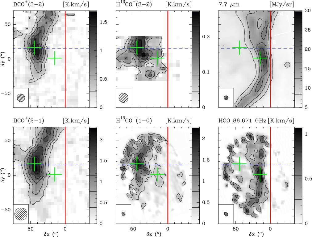 Figure 1 shows H13CO+ J=1-0, HCO 10,1-00,0 (PdBI) and DCO+ J=2-1, 3-2 integrated line intensity maps (IRAM-30 m; Pety et al. 2007), as well as the aromatic infrared band emission (AIB, observed with ISOCAM, Abergel et al. 2003) that traces the UV illuminated edge of the cloud, i.e., the PDR. The DCO+ emission is concentrated in a narrow, arclike structure of dense and cold gas behind the PDR (Pety et al. 2007). Hence, it shows a very different spatial distribution than the emission of ``PDR tracers'' such as C2H, C4H, c-C3H2 (Pety et al. 2005), HCO radicals (Gerin et al. 2009), vibrationally excited H2 (Habart et al. 2005) or the AIB emission (Compiègne et al. 2008). The H13CO+ J=1-0 emission follows the DCO+ distribution and it mostly delineates the dense core that coincides with the DCO+ emission peak. Nevertheless, while DCO+ is not detected in the illuminated edge, H13CO+ does show a faint emission in the PDR. Therefore, the small field-of-view shown in Fig. 1 contains two different environments: a warm PDR and a cold core shielded from the external UV radiation field. In the following sections we analyze these emission maps to determine the ionization fraction gradient in the region.