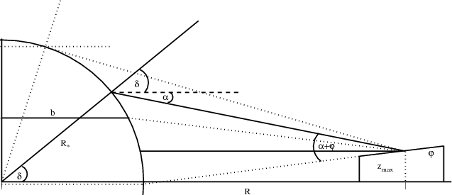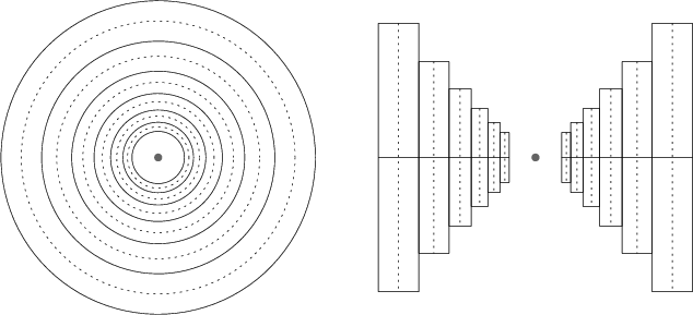 Figure 1: Disk ring structure as adopted for our calculations. The radius of the rings increases exponentially. The left panel shows a face-on view of a disk, the right one a vertical cut viewed edge-on (height is not to scale). The dotted lines are the radii R for which the models are calculated while the solid lines show the borders of a disk ring. The disk structure is assumed to be constant over the ring width. |