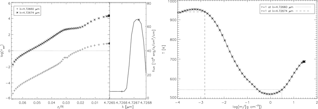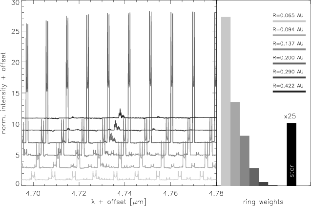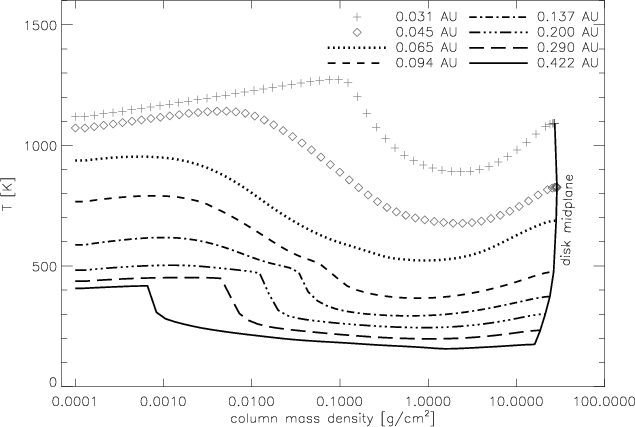 Our paper is structured as follows: in Sect. 2 we will explain the construction of our model structure and synthetic spectra. We will concentrate on the basic concepts and highlight the implementation of the solution. In Sect. 3 we will present synthetic spectra for the disk of the T Tauri star GQ Lup and compare these with CRIRES infrared observations to show the potential of our 1D disk model code. Section 4 will give a summary and an outlook of our work.