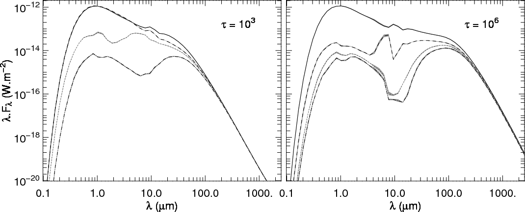 - for edge-on configurations, the flux in the near- and mid-infrared is dominated by packets originating from the dense central regions of the disc. These packets will be scattered towards the observer in the surface layers of the disc, where the probability of interaction is very low (due the very low density). Packets escaping the dense regions (after a large number of interactions) almost always go through the surface layers without interacting with the dust grains and large number of packets are required to converge SEDs or images in this regime.