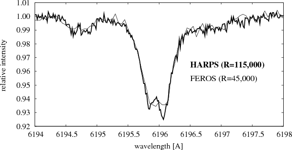One of the set of spectra used to analyse the interstellar absorption features was acquired with the spectrograph HARPS. High Accuracy Radial velocity Planet Searcher (HARPS) at the ESO La Silla 3.6 m telescope is dedicated to the discovery of extra-solar planets and it can measure radial velocities with the highest accuracy currently available. HARPS produces the spectra with a resolving power of 115 000 in the spectral range 3780-6910 Å, with a signal-to-noise ratio of 500.