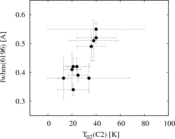 The main result is shown in Fig. 3 (and in detail in Fig. 4). The correlation between the full width at half maximum of the DIB at 6196 Å and the excitation temperature of C2 (T02) is presented. A similar relation was drawn for T04 (Fig. 5) and T06 (Fig. 6). The best correlation is shown for T02, but the others are also quite good.