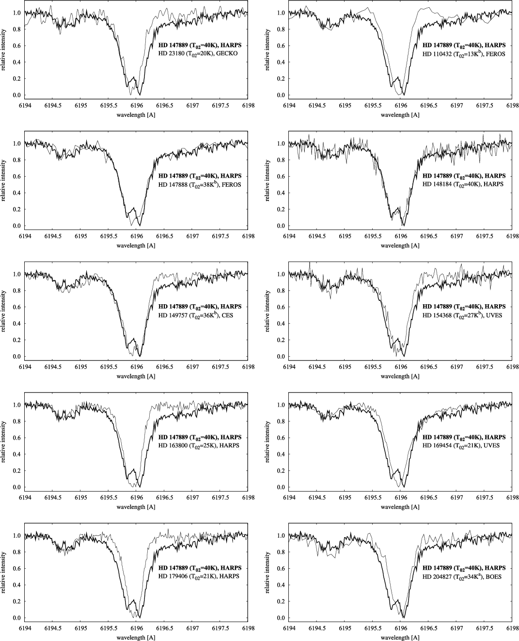 The spectra used to analyse the profiles of the 6196 Å feature were obtained with different resolution, but this does not change the widths of the reasonably broad DIB profiles. Figure 2 compares the 6196 DIB profile width in the spectra of HD 147 889, with the resolutions of 115 000 (HARPS) and 45 000 (FEROS); the FWHM estimated from these two instruments is the same (0.52 Å), but in the spectra with low resolution the substructures inside the profiles are hard to trace.