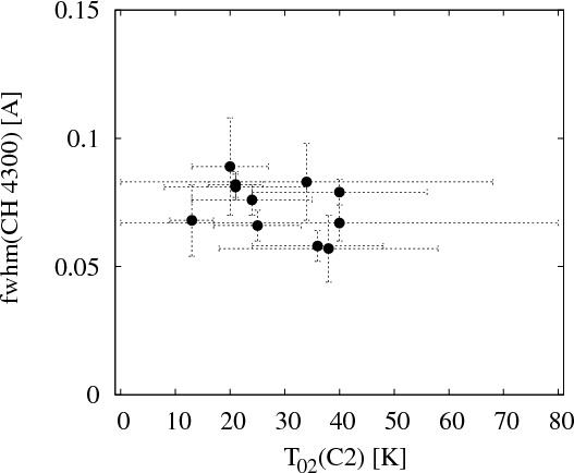 In Table 2, we also give the FWHM of CH 4300 Å to show that there is no correlation between the FWHM(CH 4300) and the excitation temperature of C2 (Fig. 7). In the directions to HD 147 888 and HD 204 827 observations were made with a spectral resolution about 45 000, whereas toward the rest of objects with R=115 000. To remove effects of line broadening from a lower resolving power we measured the FWHM of CH 4300 Å towards HD 149 757 in the spectra with R=115 000 and 45 000; the relation of the FWHM for different resolutions is 1.76; we divided by this value by the full widths at half maximum of CH 4300 Å in the directions of HD 147 888 and HD 204 827 before being plotted (Fig. 7).