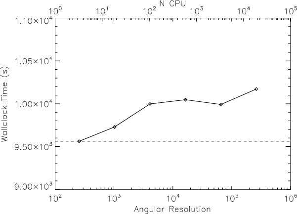 in wall-clock time from 16 CPUs to 16 384 CPUs is acceptable given the